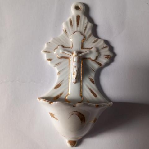 Acquasantiera bisquit in porcellana bianca e finiture in oro