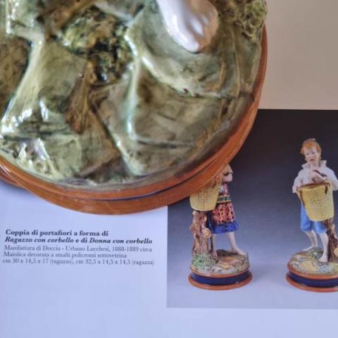 Coppia di portafiori a forma di ragazzo con <corbello e donna con corbello
