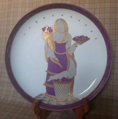 Piatto in porcellana decorata a cromo in viola, grigio e oro segnato a punta di agata e dipinto a mano in viola e oro, raffigurante "L'abbondanza" di Giò Ponti