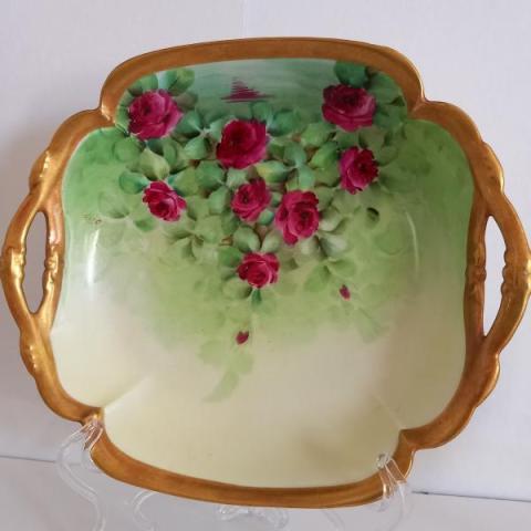 Ciotola portafrutta decorata con piccole rose rosso porpora , dipinto dal pittore fiorista firmato O. Tei?