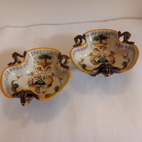 Sono due centrotavola trilobati di piccole dimensioni, cm. 19x19, poggiati su un piede con stesso profilo, è decorati esternamente con motivi di tralci, foglie e grappoli d'uva in rilievo, dipinti in verde e bruno su fondo blu.