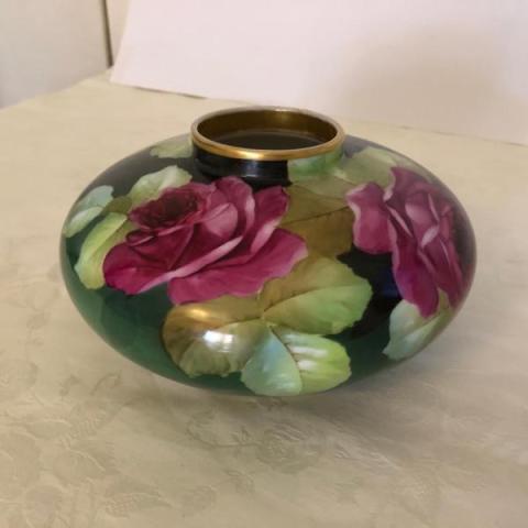 Vaso con suggestivo decoro di rose rosse tra foglie e colori.