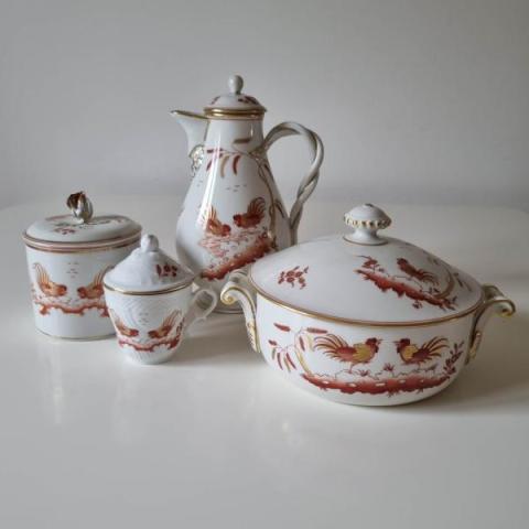 Il decoro Galli rossi era gia' in produzione a Doccia nel 1747; il decoro è attribuito a Ferdinando Campostrini ed era eseguito in rosso, blu, verde e nero. Raffigura dei galli (uno o due) combattenti vicino ad un salice (qualche volta un bambù) tra le rocce stilizzate.