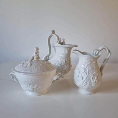 Tris composto da tazza da puerpera, versatoio e lattiera istoriato