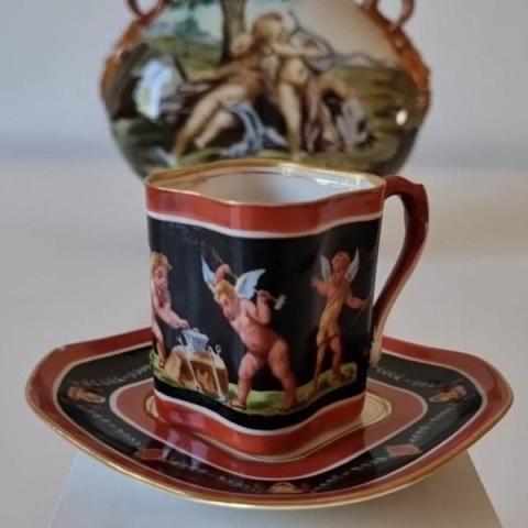 Tazzina Richard Ginori, forma spezia, decoro classico con putto, realizzata per struttura di Pompei, primi anni del 900