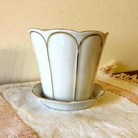 Piccolo cache pot finiture in oro della pittoria di Doccia. Il cartiglio della pittoria copre il marchio Haviland/Ginori, questo evidenzia che il pezzo bianco è stato fatto dalla fabbrica Haviland in Bavaria tra il 1923/1937. La finitura in oro deve essere stata fatta a Doccia.