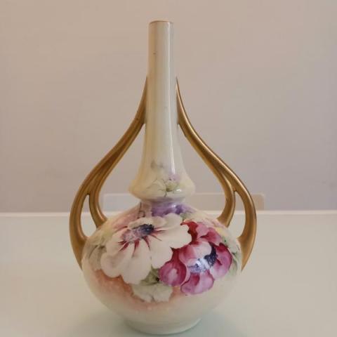 Vasetto in porcellana bianca decorato dai pittori dei fiori con Anemoni multicolori , la forma è liberty. Il vaso è stato presentato alla mostra internazionale di Torino nel 1902, manici in oro , firmato L.D.