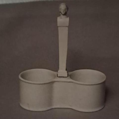 Porta ampolle in maiolica bianca formata da due contenitori cilindrici con al centro un'asta tronco piramidale, che si conclude con una testa di un erma bifronte.