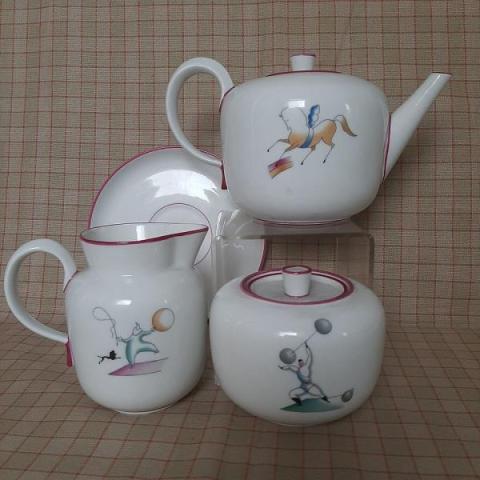 Teiera, zuccheriera, lattiera e piattino della serie  "Il Circo" di Giò Ponti