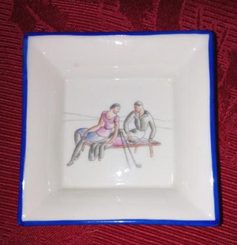 Questo posacenere datato 1938 rappresenta la serie dello sport del Golf che sebbene non menzionato nel catalogo storico della Manifattura, mantiene lo stesso tono ironico con un evidente contatto con il mondo moderno.