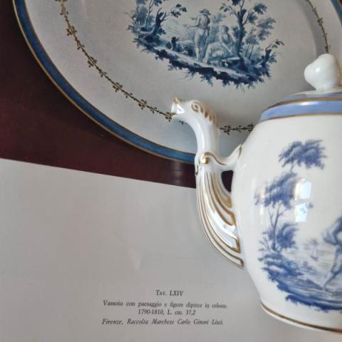 si presenta un decoro del 1790/1810 con paesaggio e figure dipinte in celeste