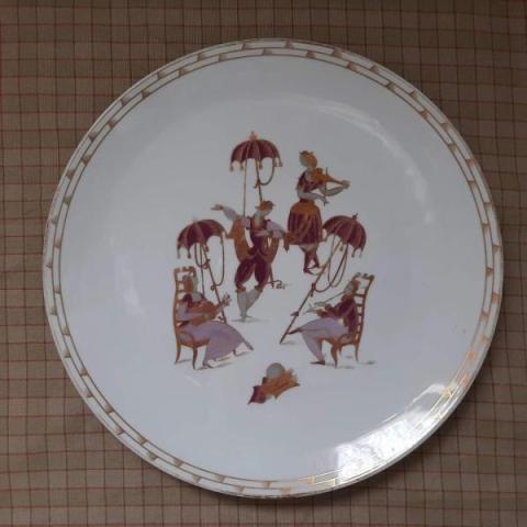 Piatto in porcellana decorata a cromo innoro, viola e grigio e dipinto in oro