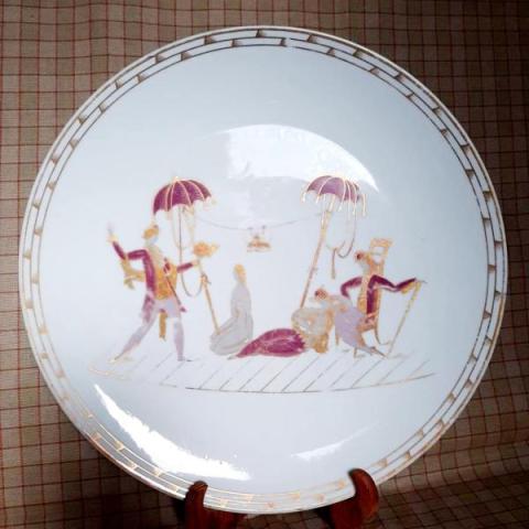 Piatto in porcellana decorata a cromo in oro, viola e grigio e dipinta in oro