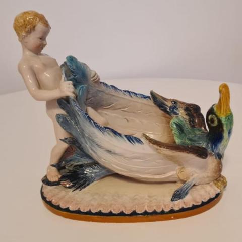 Portacarte in maiolica, ideato da Urbano Lucchesi (1884/1900) marca "Ginori" sormontato da corona, n. "369", che raffigura un fanciullo con un'anatra. È un oggetto definito di "fantasia" . Un esemplare simile è conservato al Museo di Doccia